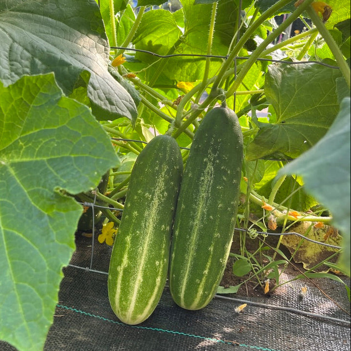 Planting Instructions: Seed indoors 1/2 inch deep. Line out transplants after risk of frost has passed, spacing 5-6 seed apart. Direct seed in raised hills sowing 5-6 seeds 1/2 inch deep. Soil temperature should be at least 21 degrees Celsius. Space mounds 5-6 feet apart, thinning to 3 plants per mount. Cucumbers can be trellised.